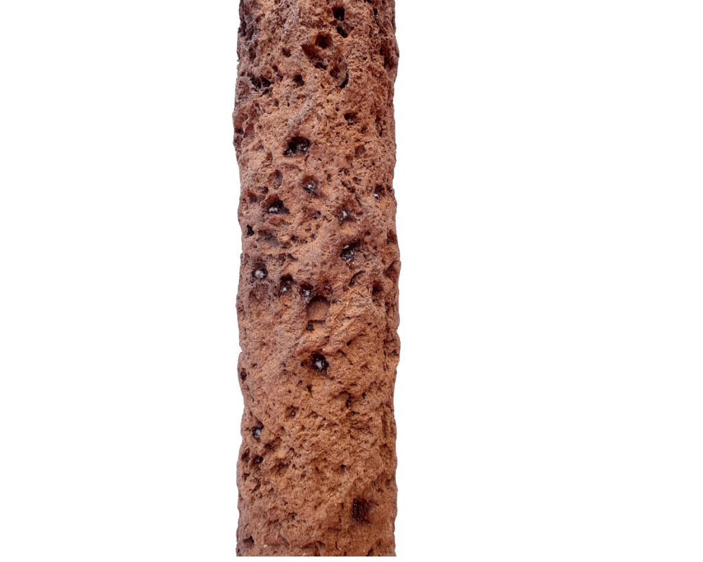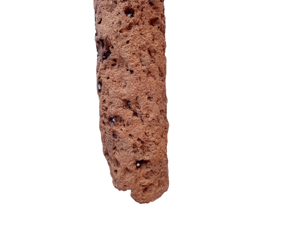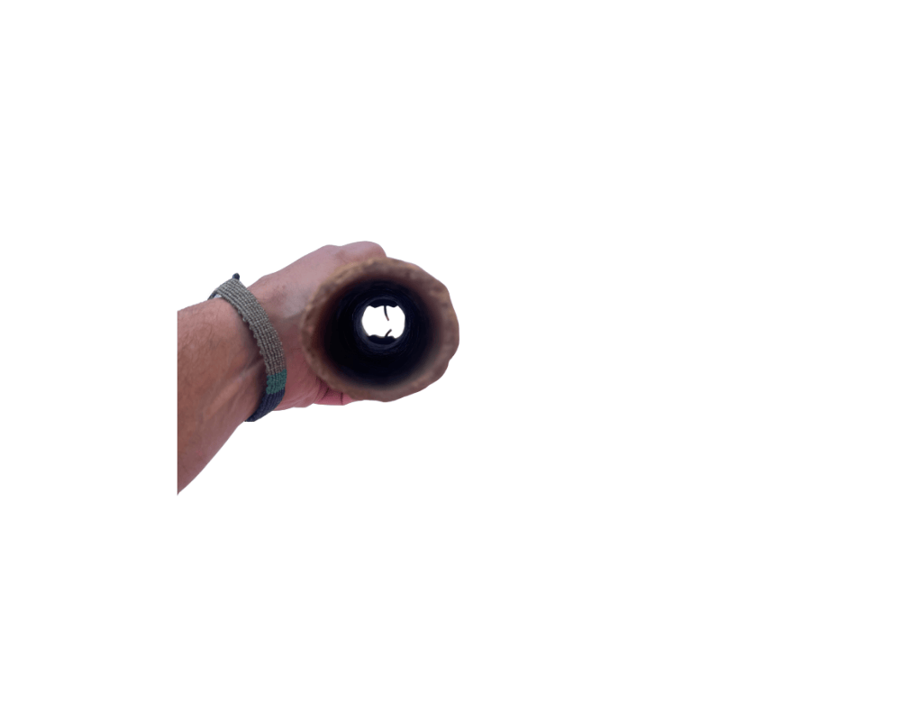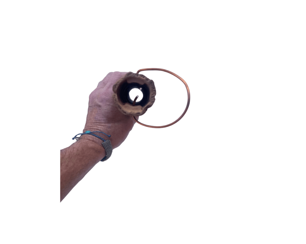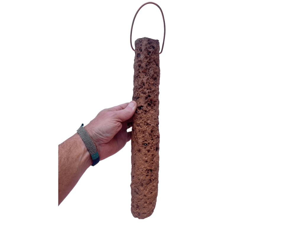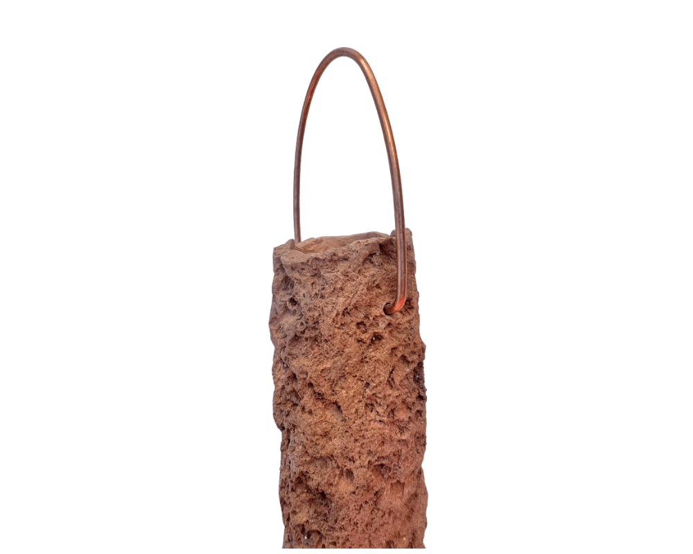 Made of stoneware ceramic which will last indefinitely verses organic mounts that eventually degrades over time such as wood and cork. This is a tube design orchid mount , brown in color , unglazed and has a rough textured surface on the outside. Has a solid copper wire hanger. The copper hanger is more attractive than the typical galvanized metal wire you see being used for hangers. Copper will develop a beautiful patina over time if kept outside. Chocolate brown to blue/green patinas possible depending on time and environmental conditions. Dimensions are approximately 15" in length, 2-1/4" outside diameter. Clay thickness is approximately 1/4". Dimensions are in inches.