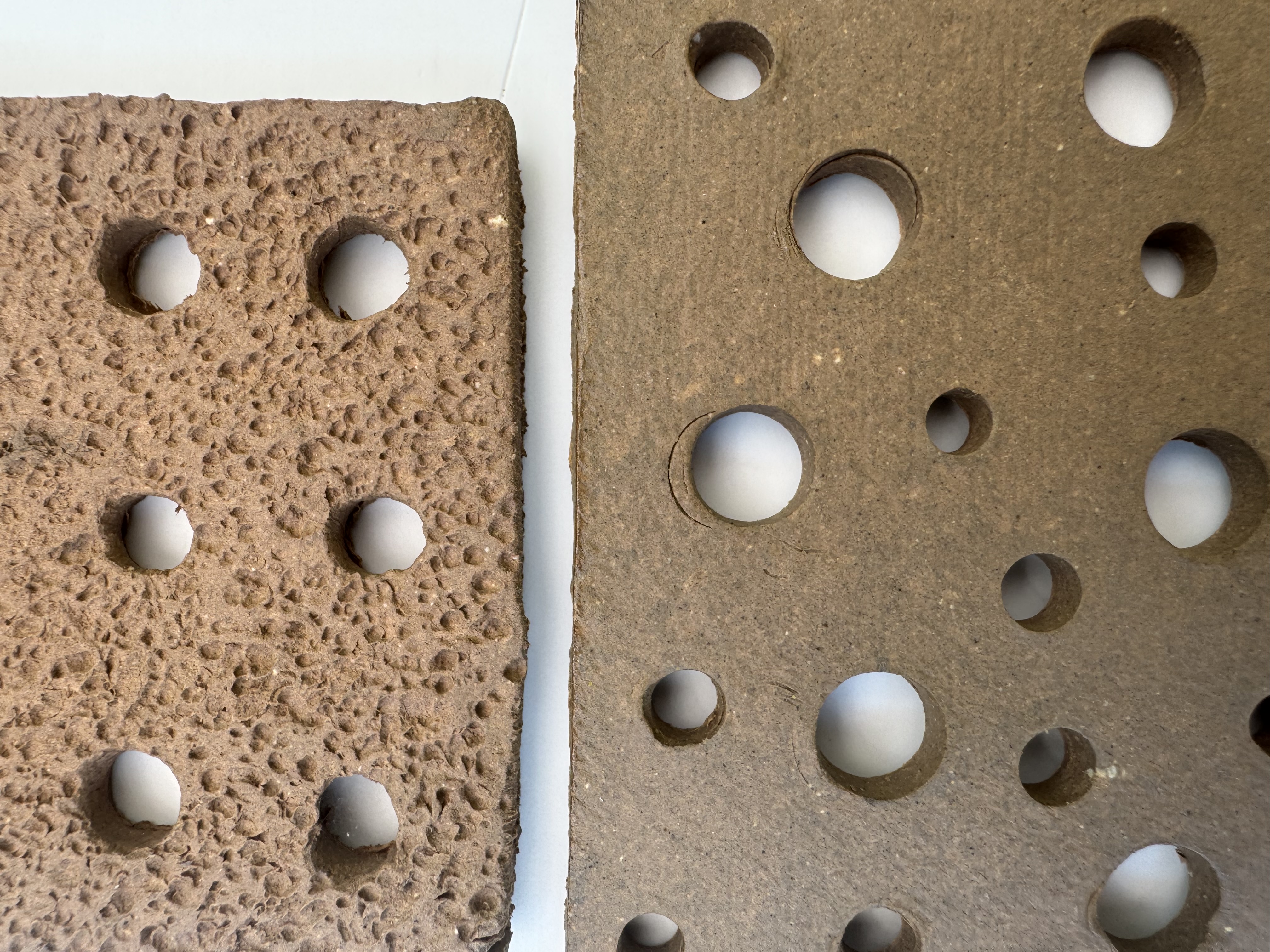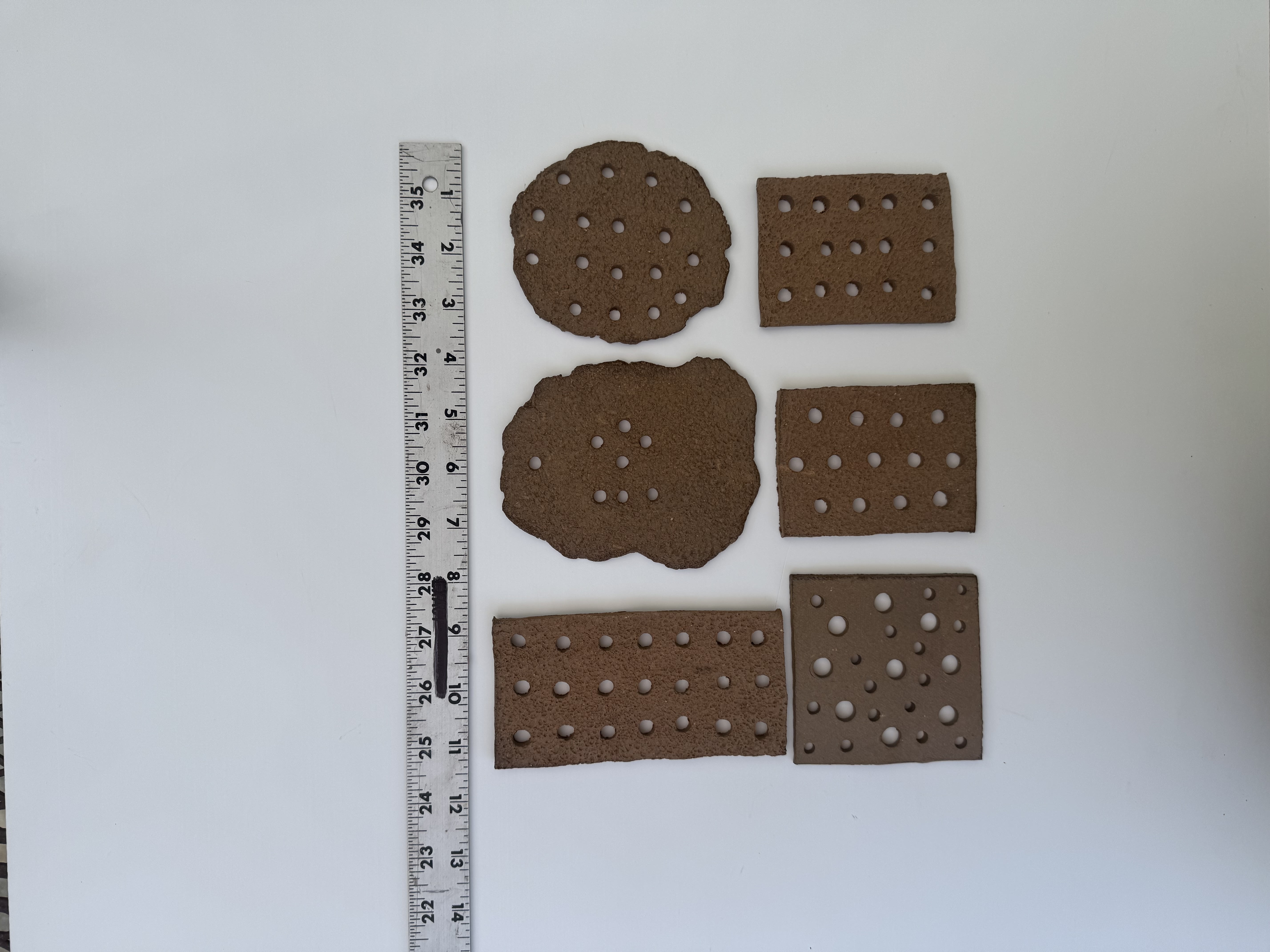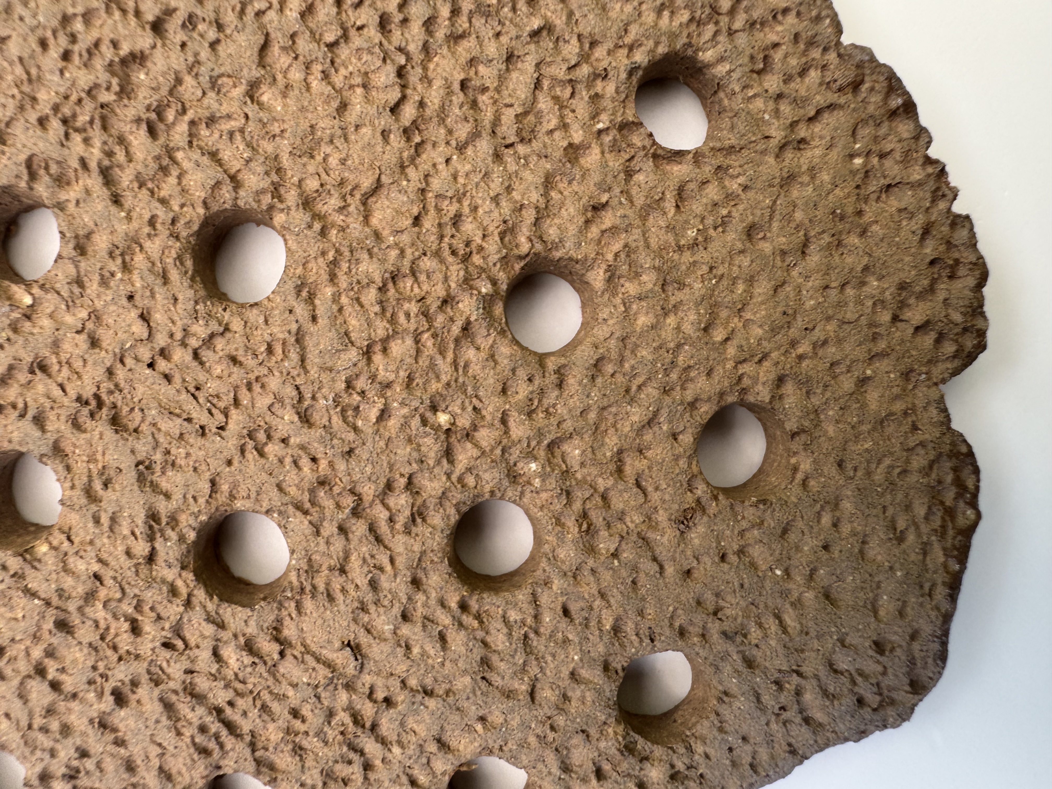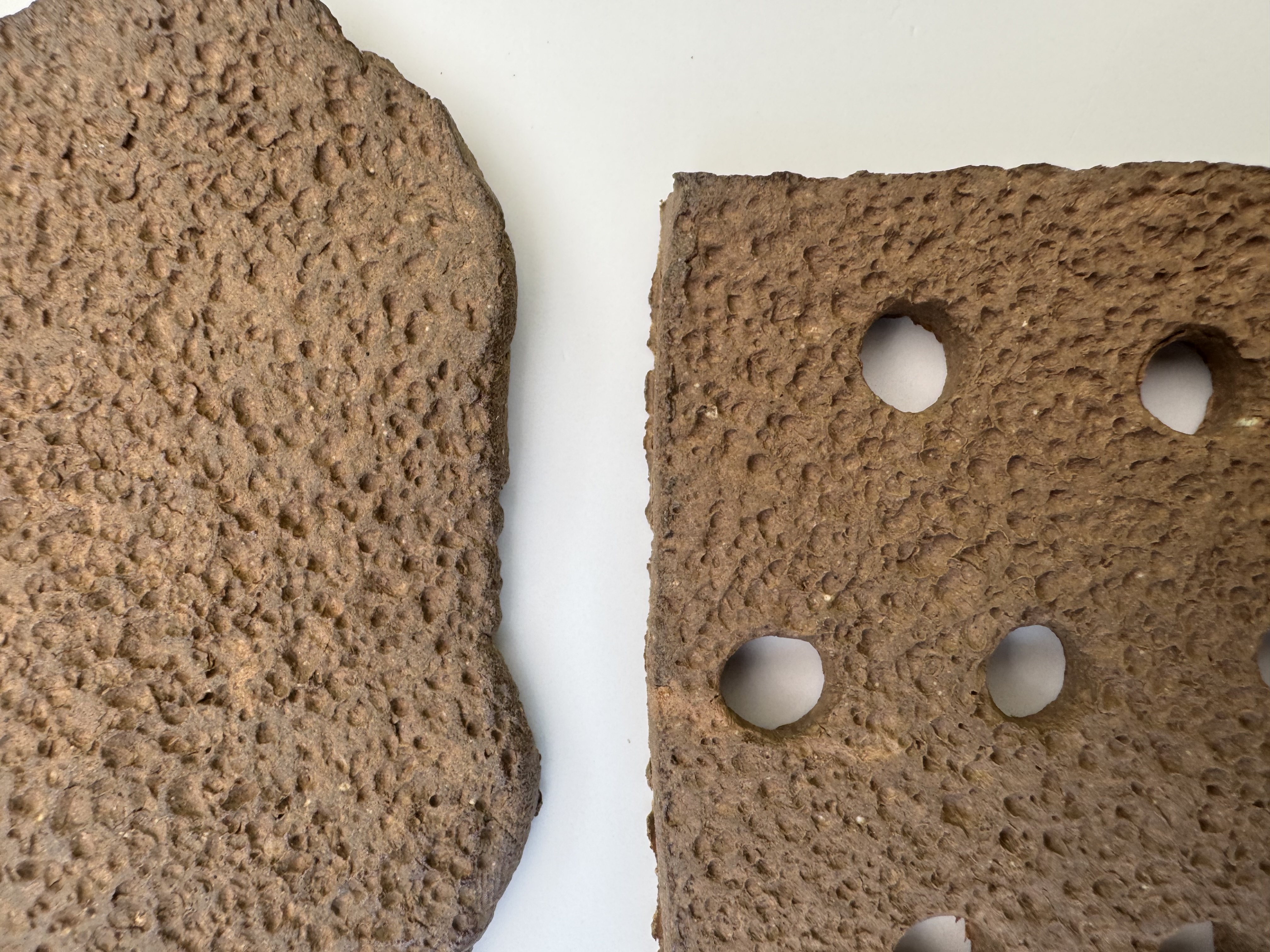Handmade from rolled clay slabs and various hand tools from stoneware clay. Some tools I make myself. Once dried, piece is then fired to cone 6 in a ceramic kiln. The whole process takes several days. Although I repeat many designs, each piece is unique and no two are exactly the same. Many of my designs are intended to be rough hewn in appearance with imperfections such as rough, random edges. The random edges is one of my favorite designs. Gives a natural looking element to the mount.